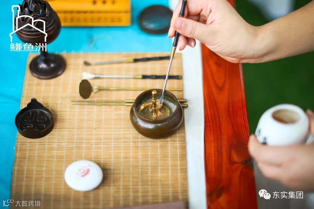 琴声瑟瑟,弦乐悠扬,一名女子身着立领白裙,用古筝弹奏出一曲曲雅乐,为这场盛宴伴奏;另一名身着白衣的女子,为来往宾客泡上一杯杯热茶,茶叶的清香萦绕在周围,微微泯上一小口,茶香四溢,让人沉醉;书法大师现场挥洒着墨宝,为鳒鱼洲的重生书写着新的篇章;调香人气定神闲地将不同的香料呈盛入香炉,混合着释放出奇妙的梦幻味道。