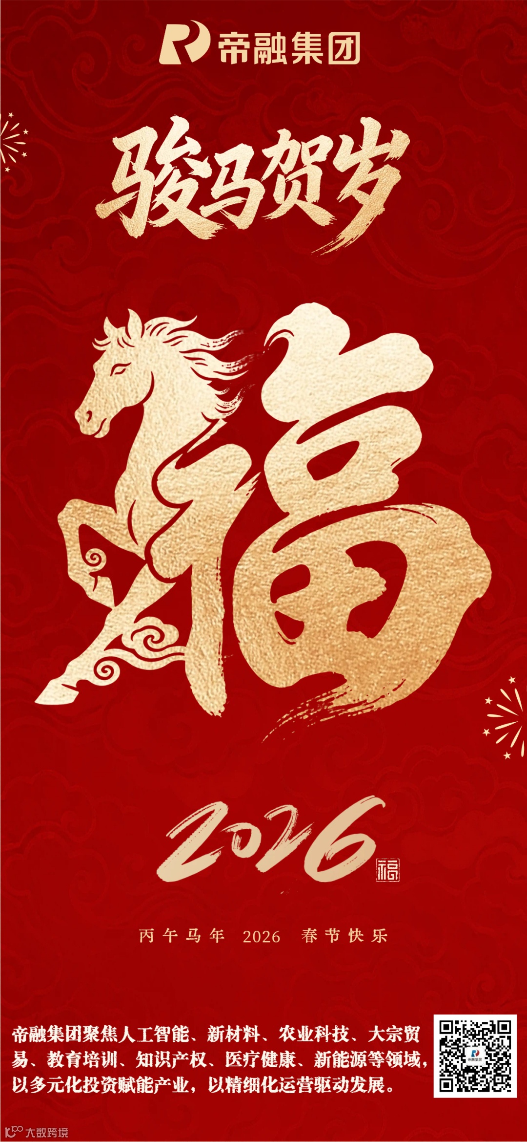 新春启华章,骏马踏春来。帝融集团恭祝全体同仁、合作伙伴及社会各界朋友,除夕夜安康顺遂,马年大吉大利!愿新的一年,我们携手并肩,以一马当先的冲劲、马不停蹄的干劲,共赴繁花似锦的新征程,共创互利共赢的新未来!