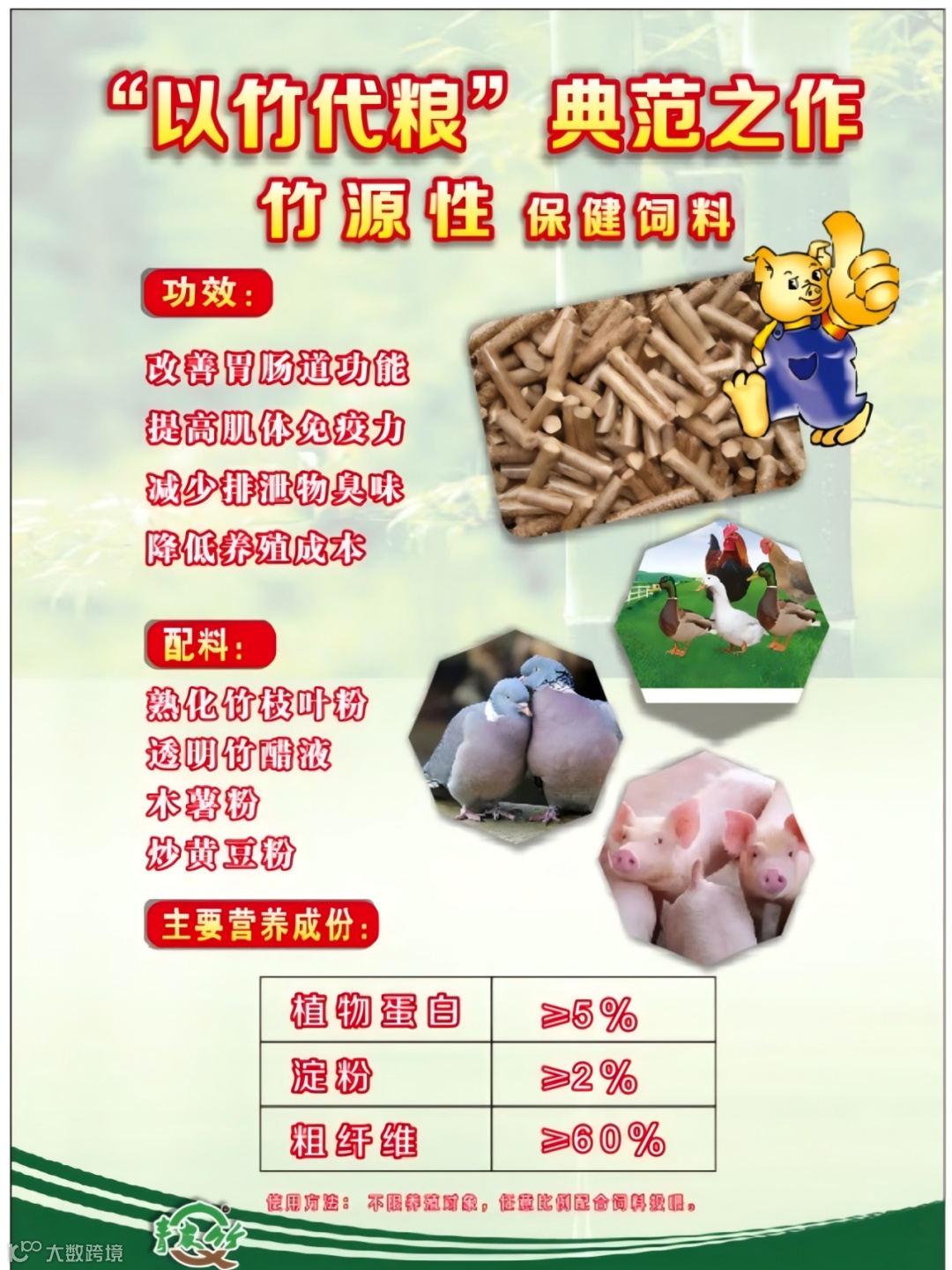 以竹子为核心原料,无化学添加剂,饲喂后不易引发畜禽肠道不适,减少养殖动物排泄物臭味,保障养殖产品安全,改善养殖环境。