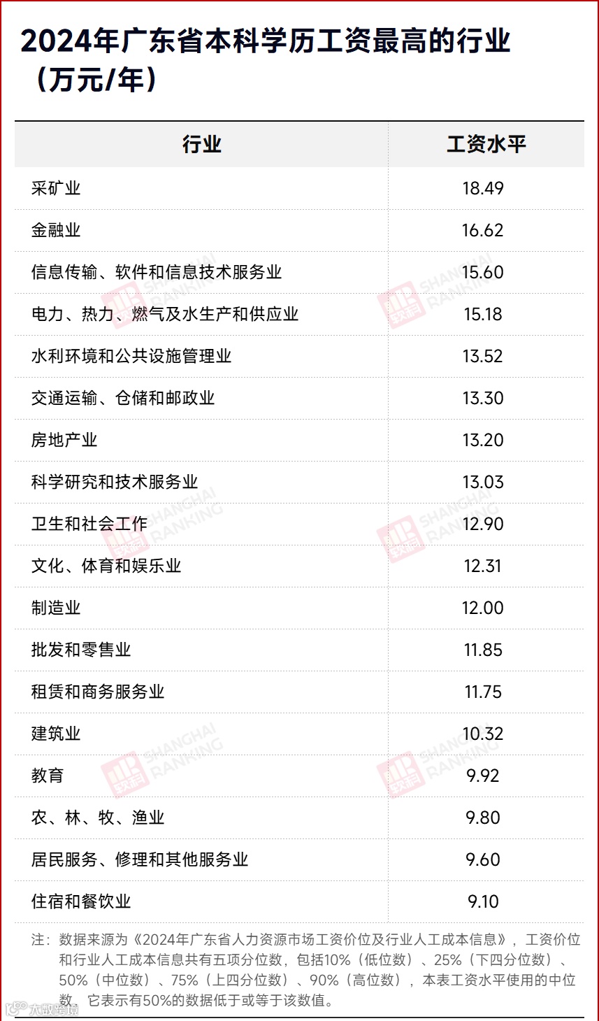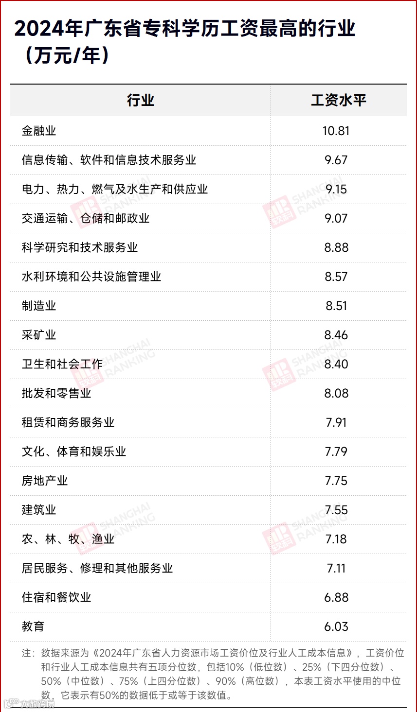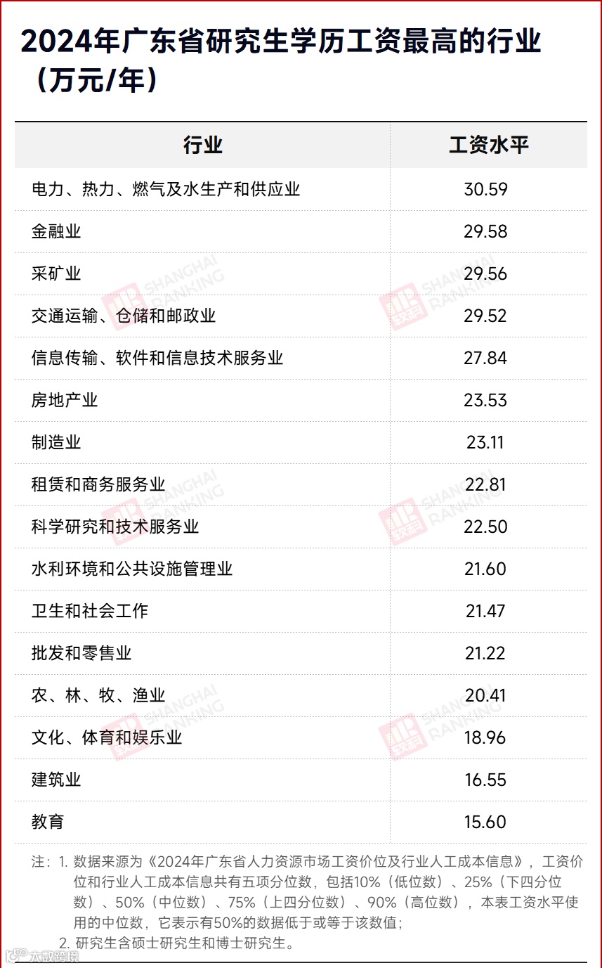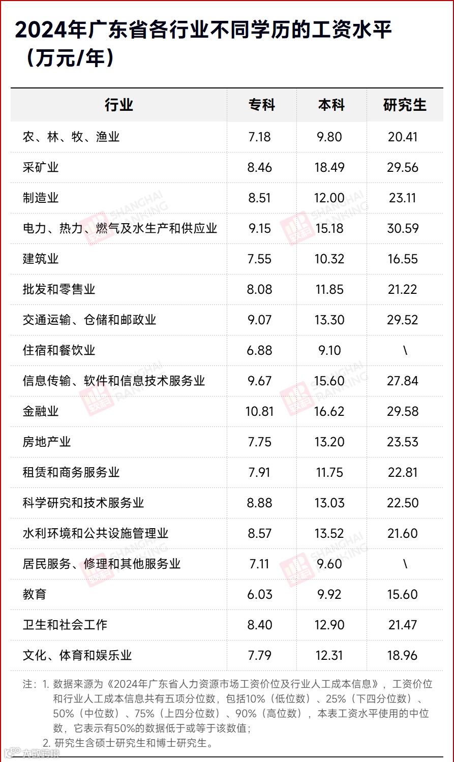以广东省为例,不同学历在各行业的工资水平存在显著差异。金融业、信息传输、软件和信息技术服务业,以及电力、热力、燃气及水生产和供应业,这三大行业无论专科、本科还是研究生学历,工资水平均名列前茅。