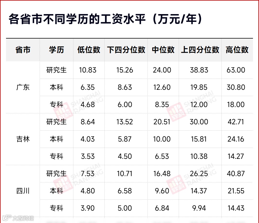 以上是软科职教依据各省市公布的企业薪酬调查信息及人力资源市场工资(指导)价位,整理出了不同学历的工资水平数据。接下来,让我们一同探寻不同学历的工资差距及其背后的原因。