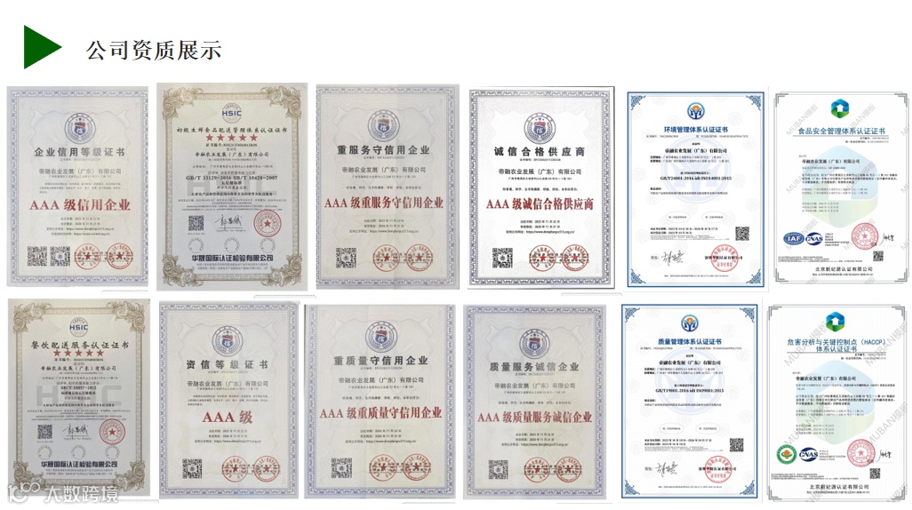 目前公司已取得了包括ISO、HACCP、诚信服务、安全供应链、紧急预案、五星售后、履约能力达标、绿色供应链、初级生鲜配送管理餐饮配送服务体系等60多项体系认证。自建全功能农残检测室、理化检测室以及具备完整的食配溯源体系,所有销售产品全程检测、全程可溯源。