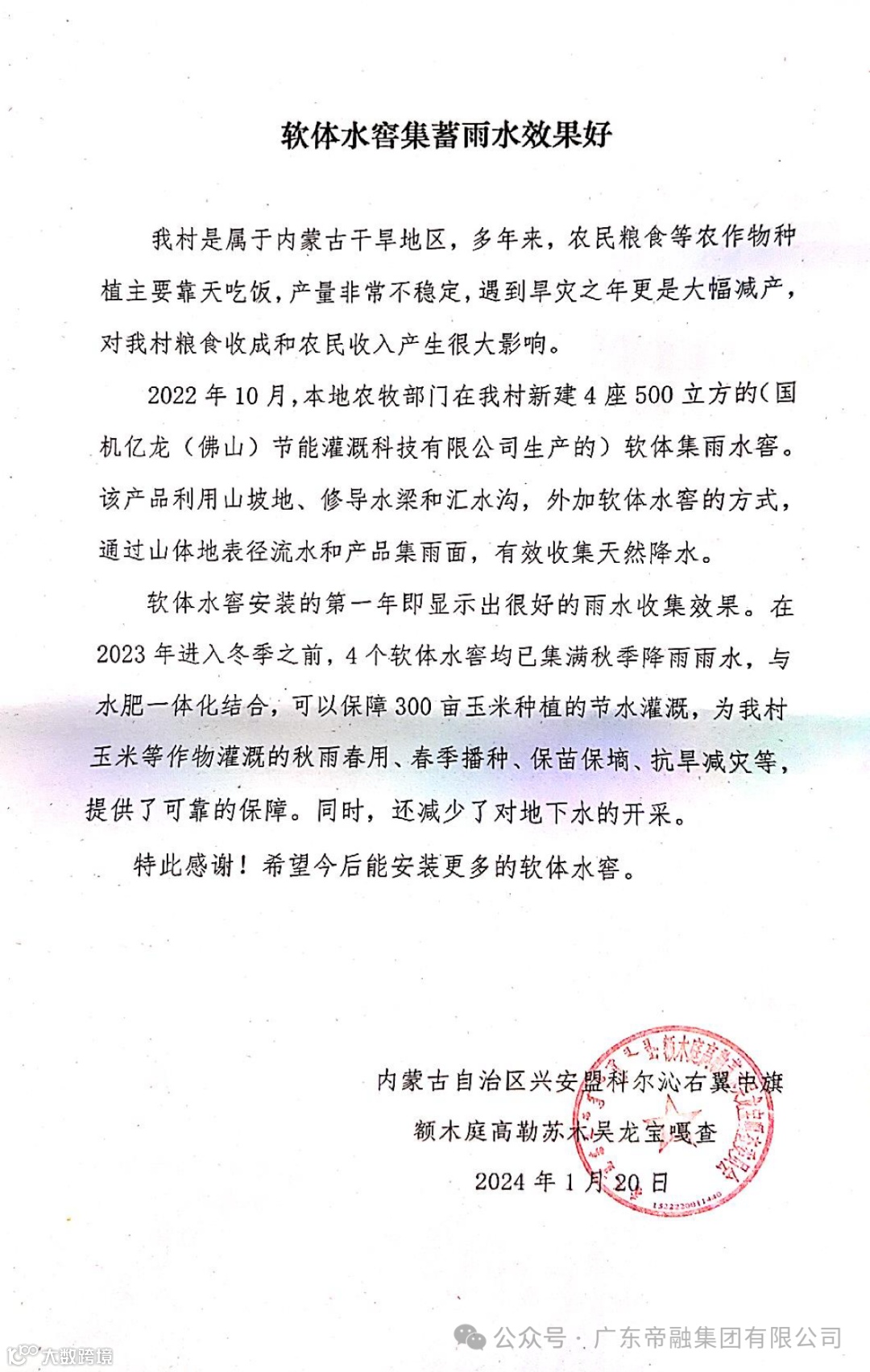 导读:近日,帝融集团核心子公司国机亿龙(佛山)节能灌溉科技有限公司(以下简称:国机亿龙)荣获兴安盟地区感谢信,充分体