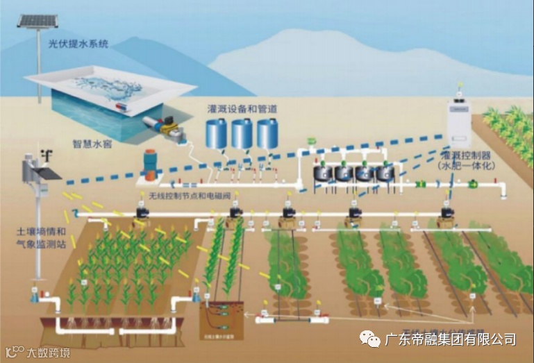 包括沟道坝蓄水工程、太阳能光伏提水系统、数字水窖、水肥一体化、爱农云管理平台。可以实时监测基地作物种植环境实现智能化、定时定量的灌溉,浸润作物根系发育生长区域,同时根据需肥规律情况进行不同生育期的需求设计,把水分养分定时定量按比例直接提供给作物。