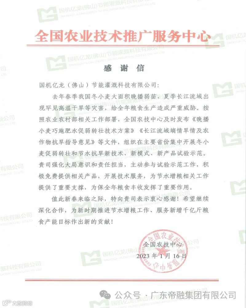 春季冬小麦大面积晚播弱苗、夏季长江流域出现罕见高温干旱等灾害,给全年粮食生产造成严重威胁。帝融集团核心子公司国机亿龙(佛山)节能灌溉科技有限公司(以下简称:国机亿龙)主动参与试验示范工作,积极免费提供相关产品,开展技术服务,为节水增粮相关工作提供了重要支撑,为保全年粮食丰收发挥了重要作用。