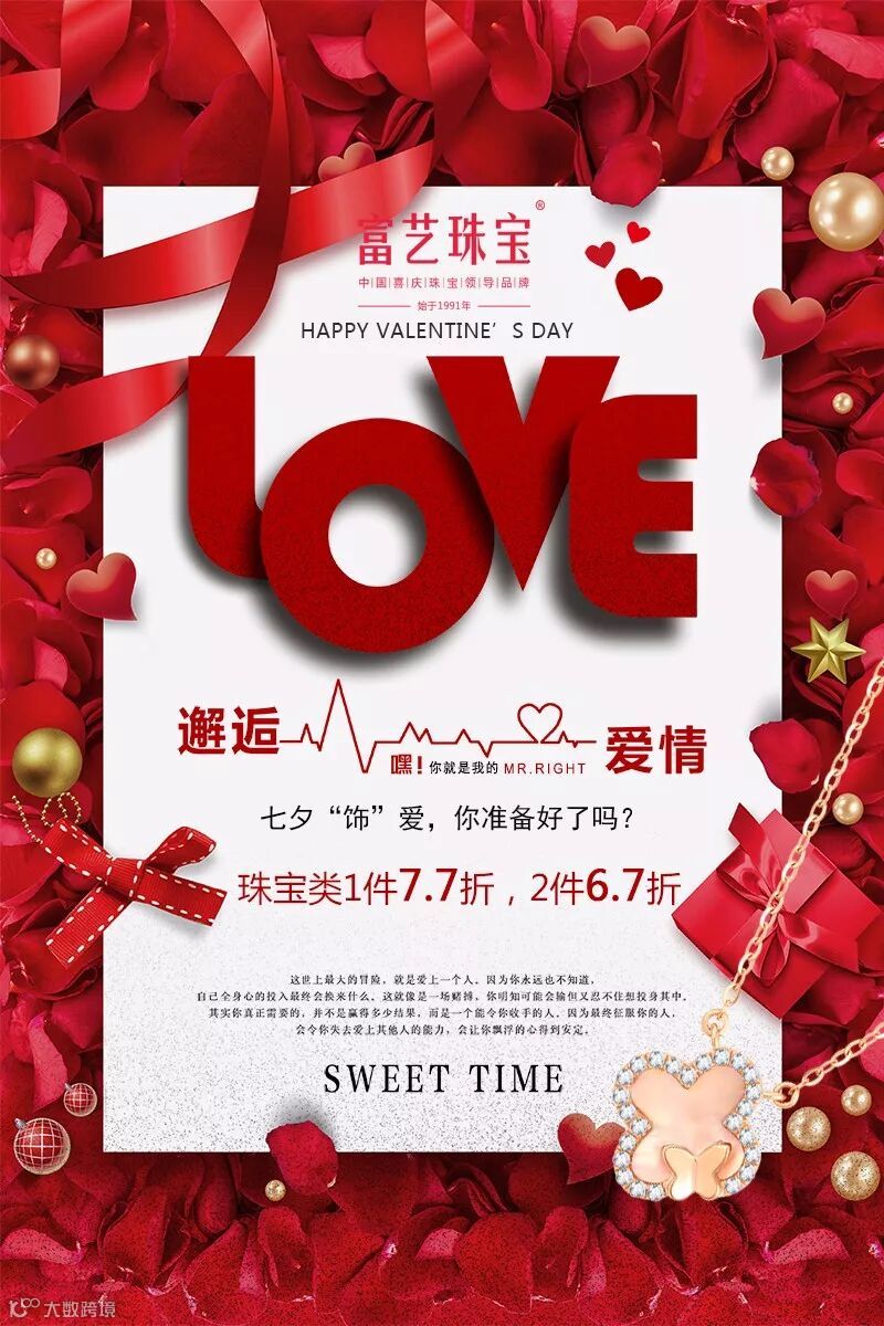 富艺珠宝七夕情人节活动;珠宝类1件7.7折,2件6.7折,