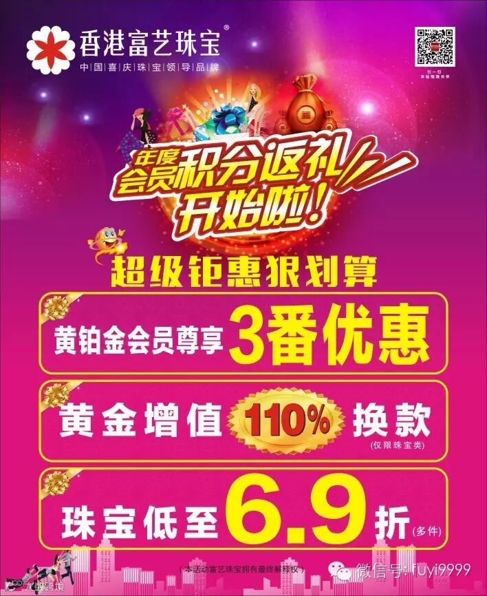好消息、好消息!!!【富艺珠宝】年度积分返礼活动开始啦!!超级钜惠狠划算哦,积分可以抵现金、可以赢百万豪礼,可以另享折上折,还有黄铂金会员尊享3倍优惠,黄金增值110%换款,珠宝多件低至6.9折,一年仅此一次,非常优惠,富艺珠宝24周年感恩回馈,感谢有您!