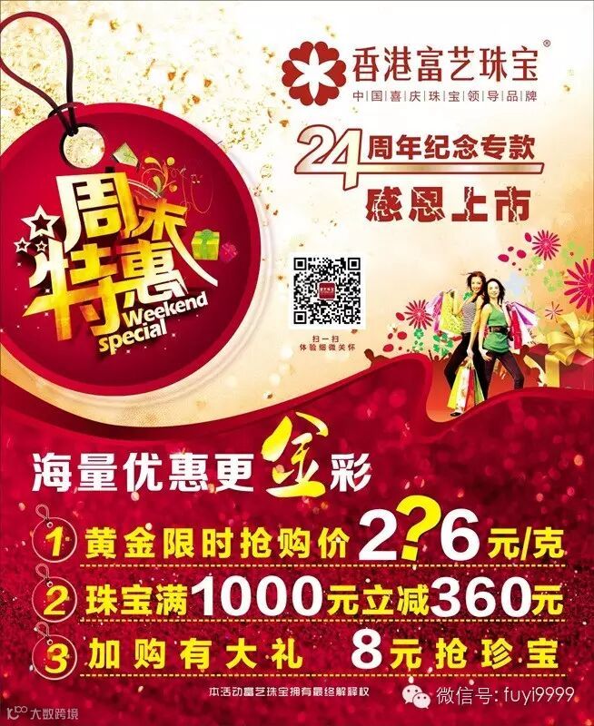 周末狂欢购 海量优惠更金彩!【富艺珠宝】24周年纪念专款感恩上市,为感谢广大新老顾客朋友的一贯支持,富艺珠宝所有分店举行“周末狂欢购 海量优惠更金彩!”特惠活动,仅限本周末(10/17-10/18日)。富艺珠宝24年相伴,感谢有您!
