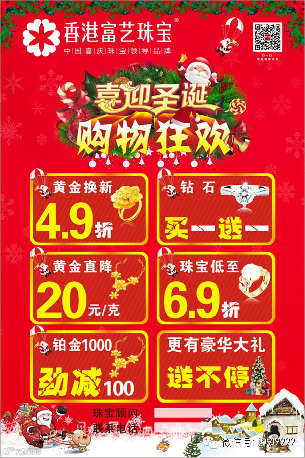 一年一度狂欢圣诞节即将来袭,在狂欢圣诞节来临之际,富艺珠宝精心为顾客推出“喜迎圣诞,购物狂欢”的大型促销让利活动,让所有想购买黄金、铂金、珠宝、钻石的顾客朋友实现低价抢购、低价换新的愿望。 2014年12月13日至2014年12月26日活动期间,富艺珠宝黄金直降20元/克,4.9折换新,钻石买一送一,珠宝6.9折,铂金1000减100劲享购物狂欢 |