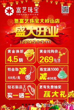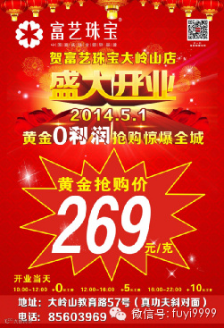 富艺珠宝大岭山店5月1日盛大开业啦!富艺珠宝隆重推出黄金269元/克0利润抢购,4.5折成本价换新,钻石新品买一送一 ,珠宝1000减400元,铂金劲减60元/克等超值让利活动,更有豪华大礼免费抽奖及精彩节目观看。时间有限,错过您得加价购买,全民抢金机会不容错过!
