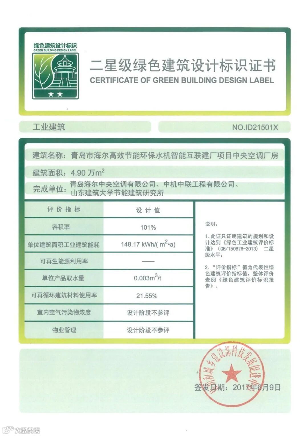 海尔中央空调互联工厂获得全行业首个国家二星级绿色建筑认证,2017年第一批绿色制造体系示范单位——绿色工厂。