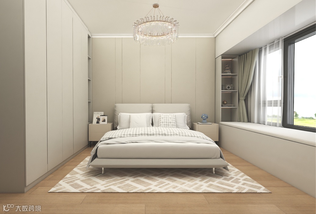 硬包背景、皮艺床、还有圆弧的床头柜,让卧室充满一种自然优雅的气质。