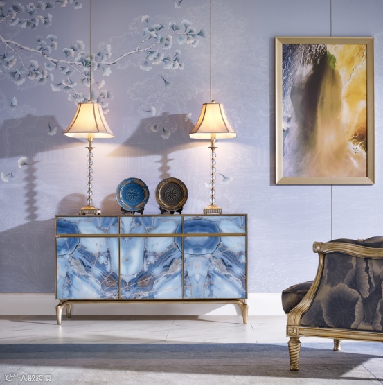 蓝调时光 L'HEUREB餐边柜,独特的艺术玻璃设计与亮金拉丝装饰的融合,加以亮光黄铜的配件,立体别致,功能与美感并存的餐厅空间,在此的每一天 , 都像度假自由、舒适。