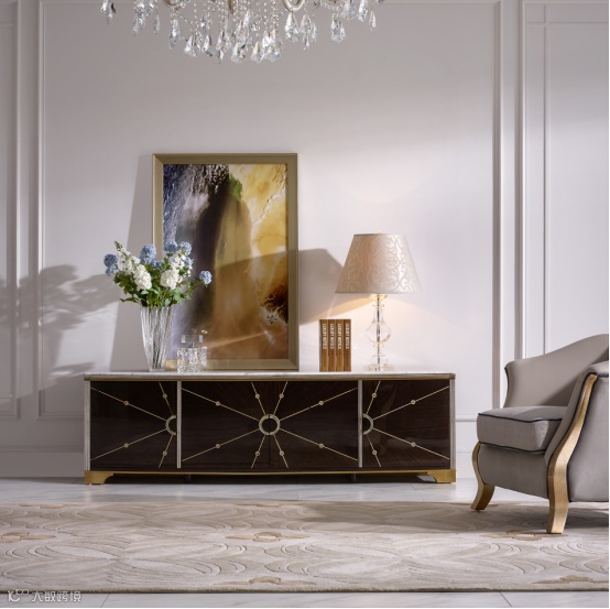 CHARISMA系类柜体,在亮金拉丝涂装工艺的基础上,几面选用了爵士白大理石,令光的折射愈加迷人,成为空间里的非凡装饰。