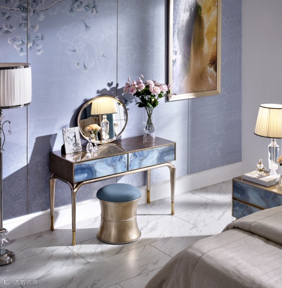 蓝调时光 L'HEUREB系类化妆台,采用亮光黄铜及艺术玻璃材质,既符合当代都市生活追求者的审美潮流,视觉上的柔和又带来平和宁静的治愈感。