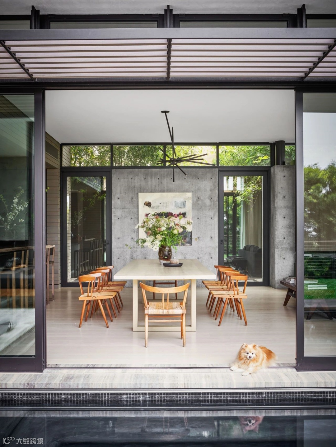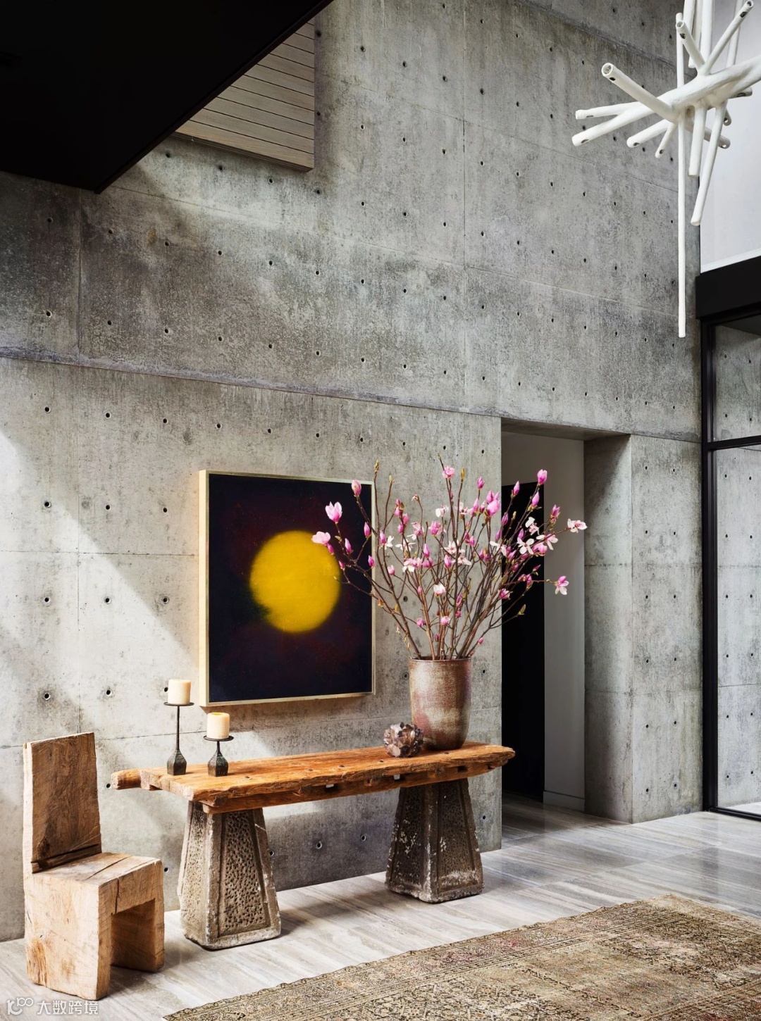 客厅正对开放式厨房,上方有天光洒下,落在艺术感颇强的吊灯上。