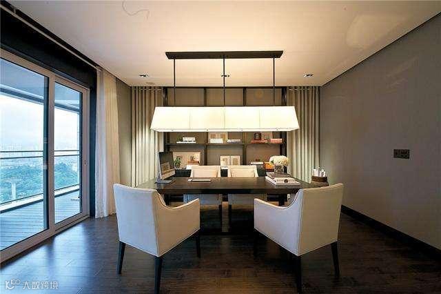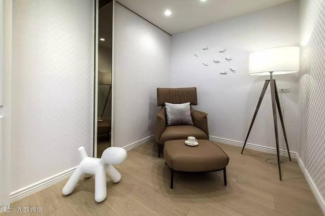 书房空间白色皮革圆形凳子与整体相搭配,看上去简洁干净的同时,又有点高贵典雅。墙壁上两盏壁灯照射出双面漏斗的形状,十分有趣,透着浓浓的现代时尚感。