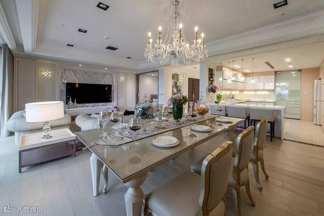 餐厅与客厅是一体的,餐厅采用的是暖色系色调。温暖大气的水晶吊灯,欧式风格的餐桌椅,显得格外的高端奢华!