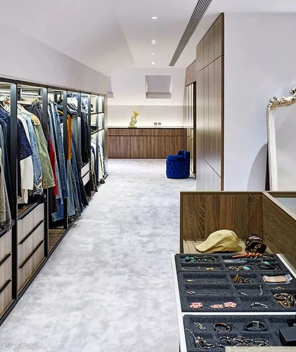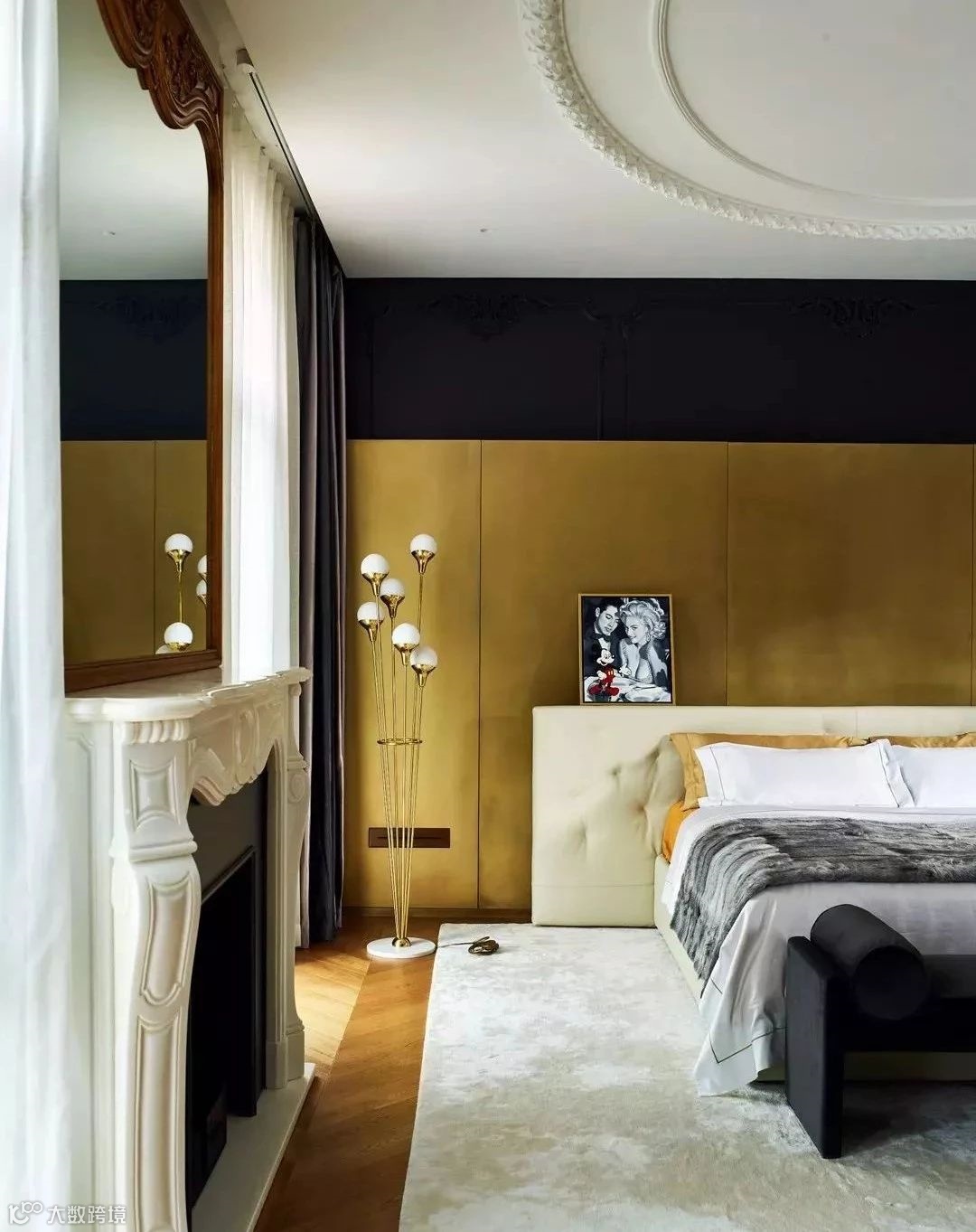 顶层的更衣室简洁、宽敞,便于衣服整理收纳。主卧延续了古典主义风格, 床头采用黄铜色背板。