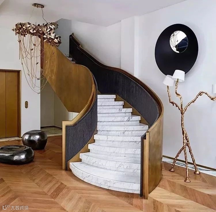 黄铜打造的楼梯,铺以大理石踏步,黄铜的表面以特殊效果做旧,以达到丰富的质感。