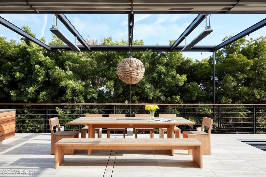 从客厅漫步出玻璃推拉门,便是一个大大的户外露台,露台外部的大片大片的绿树,是最好的装饰物,让人心旷神怡。