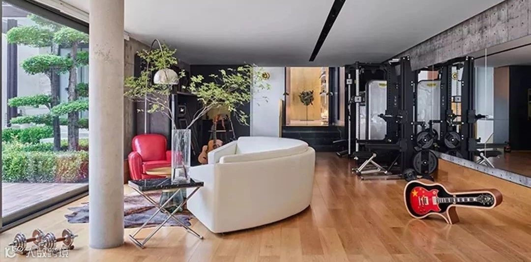 健身房连接生活区和工作室,一面巨大的落地窗面对庭院,每天早上杨坤都要在这里健身。