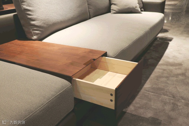 一款自带抽屉储物功能的沙发,抽屉面板能充当小茶几使用,放置茶杯、零食,抽屉内则能合理存放高频率使用的遥控器等日常公共物品。在兼顾储物功能的同时,大程度地节省了空间。