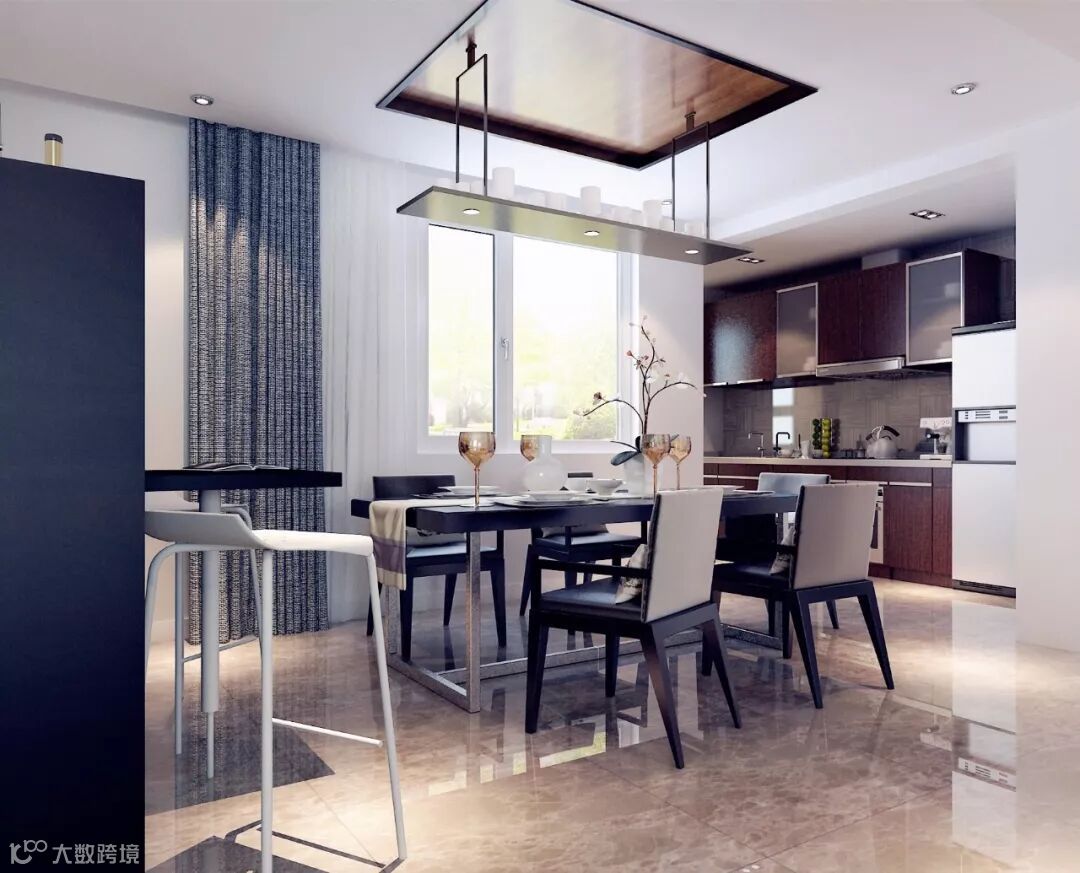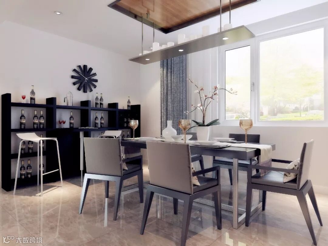 餐桌上空别具一格的吊灯设计,颇有几分未来工业风的风采,配合着餐桌的材质,给人一种沉静与现代感,简约的质感。