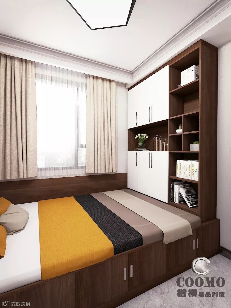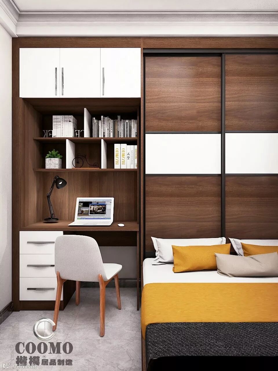 虽说是书房,但远远不止于书房。它兼有客房、书房甚至衣帽间的功能。而且,衣柜和书桌书柜都运用了嵌入式,极大提升了空间利用效率。对于小户型来说,几乎是不二选择。同时,床侧附加了收纳柜,对喜欢收纳的朋友,还有比这更高效,更令人满意的选择吗?