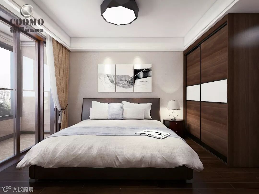 双门衣柜以其大气、厚重的气质,宣示着自己强大的存在。木质纹理清晰、材质结实耐用。色彩上,两个白色长方形条块,为衣柜赋予了时尚气息,同时调和了木色的单一。光线从阳台透射进来,床的淳厚与室内整个时尚简约的气质展露无遗。