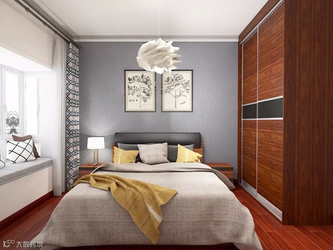 第一感受是,这样的卧室很温馨、很温暖。设计天马行空的吊灯,吸引着人的注意力。整体淡雅的色彩使人放松,光影交错中,看一本书、听一首歌,或者只是望着挂画或吊顶发呆,都很惬意。还有,飘窗那儿,有你最爱的慵懒时光。
