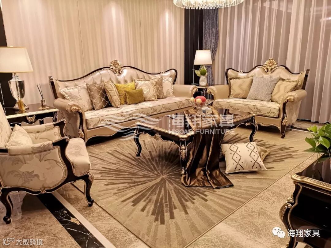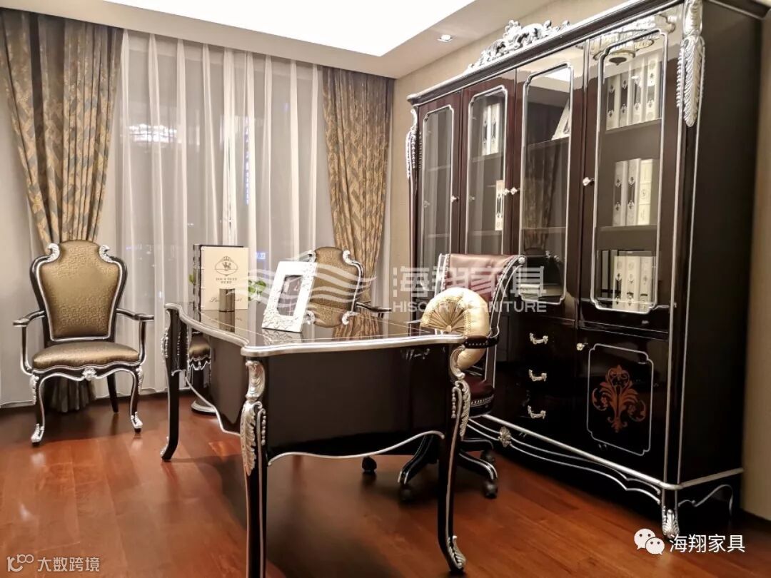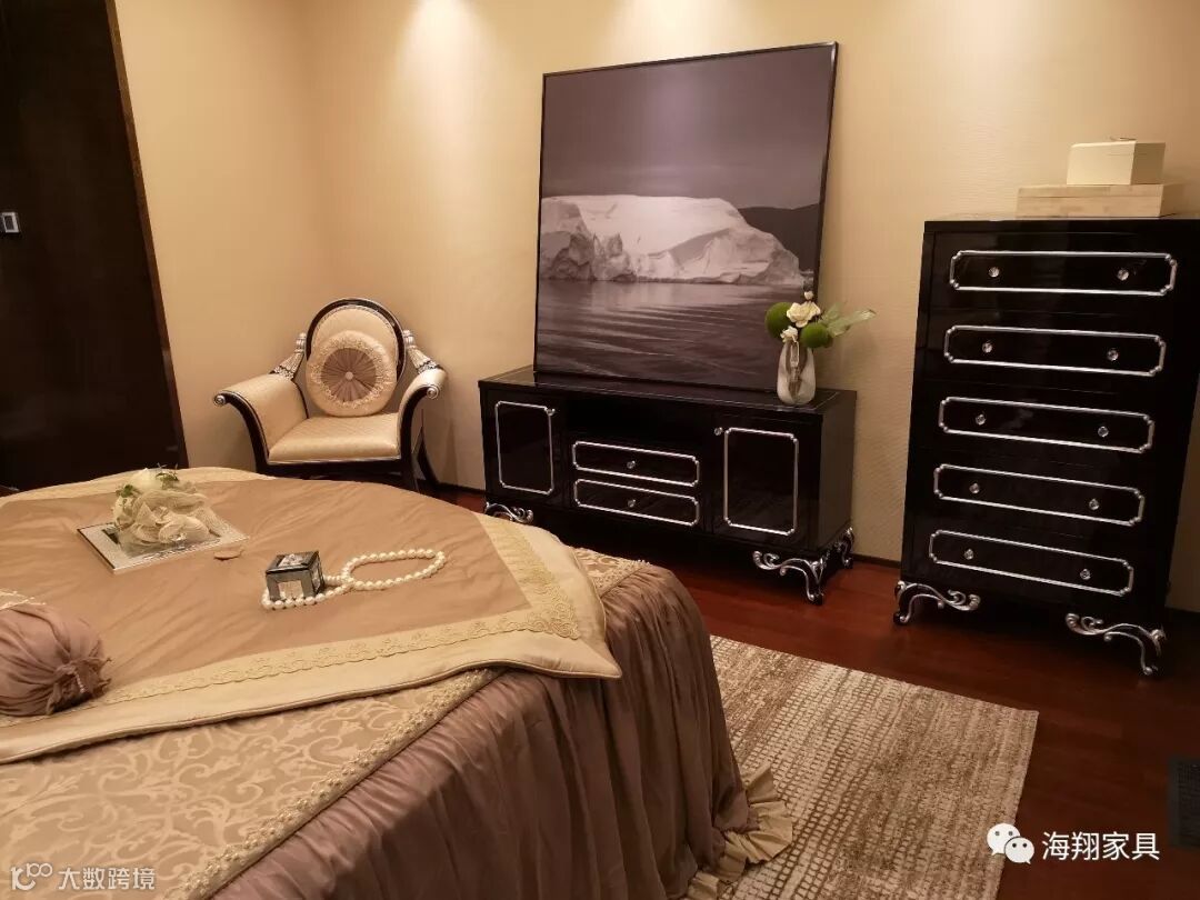 沿用法式家居昔日宫廷的古典遗风,精致的描银花纹团、古典用色底漆,布局上突出轴线的对称、恢宏的气势,细节处理上运用法式廊柱、雕花、线条,制作工艺精细考究。无论从配件到工艺,手工雕刻出处散发着“精心、优雅、唯美”的法式美学,堪称经典与时尚的完美体现。