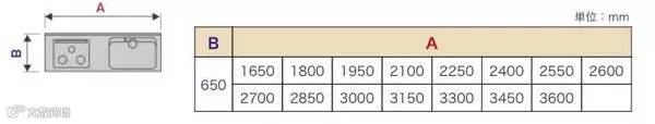 【一字形厨房】图中B为宽度:650mm。当然也有更窄的,国内也有做到550mm甚至500mm左右的。不过目前厨具越来越大的趋势加上考虑使用的便利性,建议做到650甚至700mm左右。A是标准尺寸的长度,可以做到豪华的3600mm。