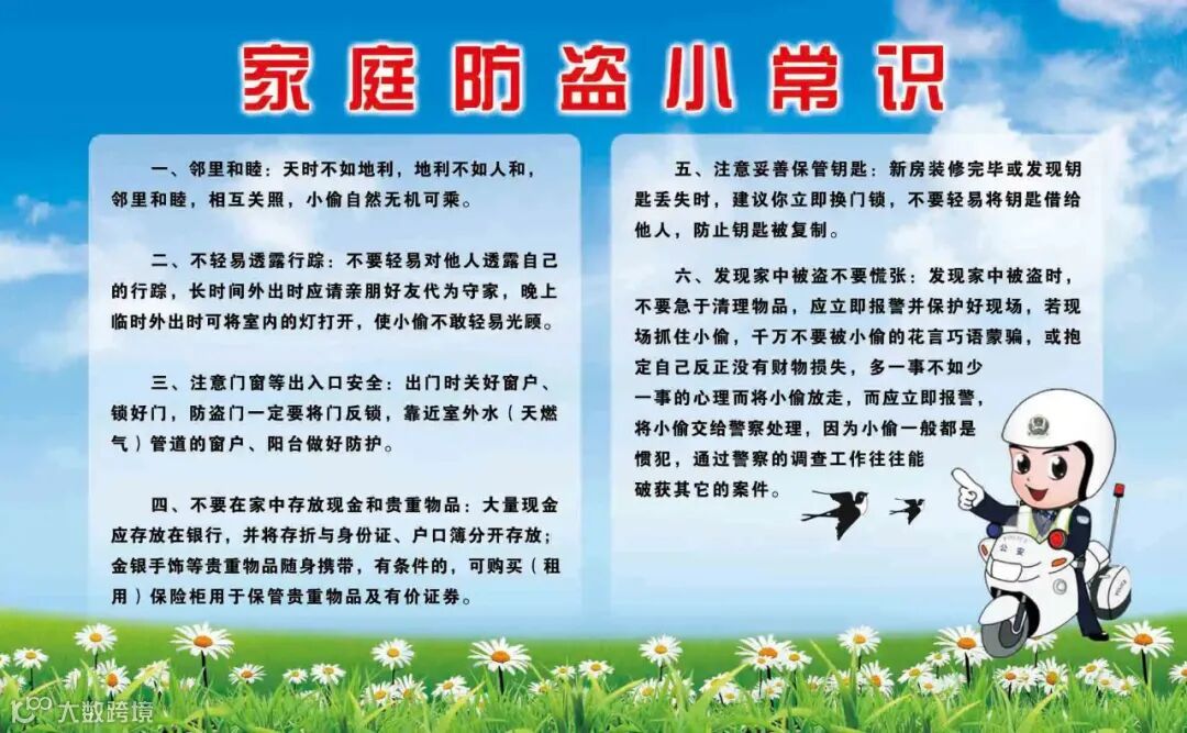 关好门窗:外出时,请务必关好门窗,反锁防盗门,不要将大量现金和贵重物品放置在家中。如有条件,可安装防盗报警装置,提高家庭的防盗安全系数。夜间休息时,要关好窗户,拉上窗帘,避免因室内光线暴露财物而引起不法分子的注意。如发现有可疑人员在小区内徘徊或窥探,应及时向物业保安人员报告。