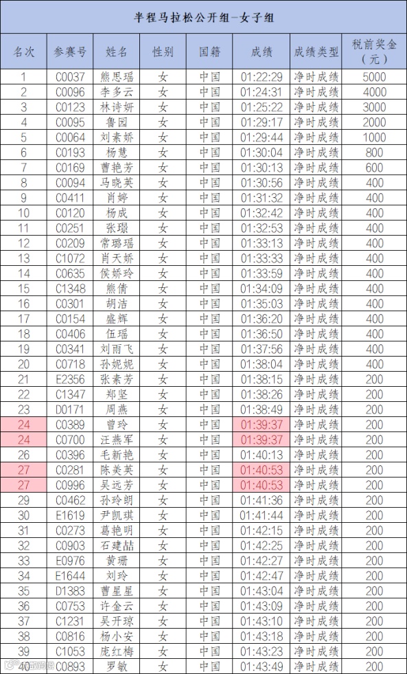 注:由于C038曾玲与C0700汪燕军净计时成绩相同,所以两位参赛选手排名并列第二十四名,第二十五名空缺;