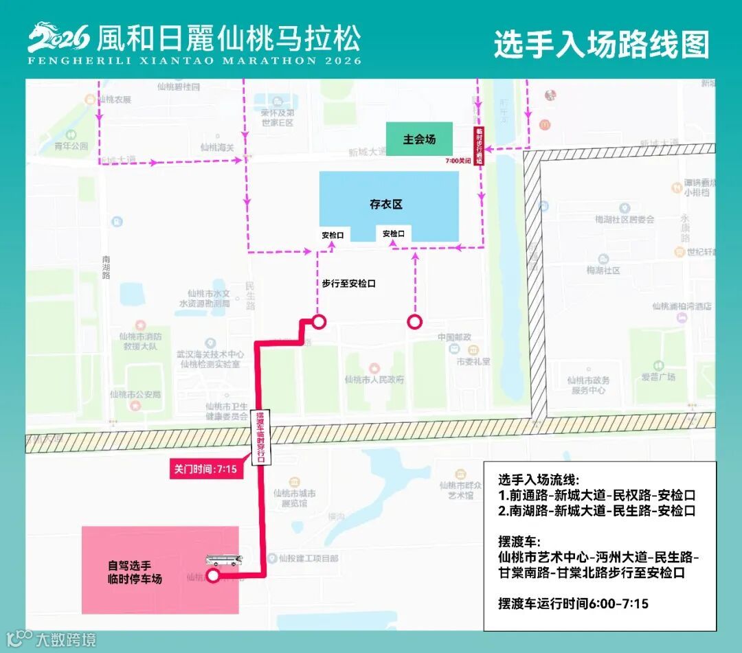 组委会为自驾参赛选手提供了短途摆渡车,摆渡时间为3月29日6:00-7:15,从仙桃市艺术中心开往最近安检口。
