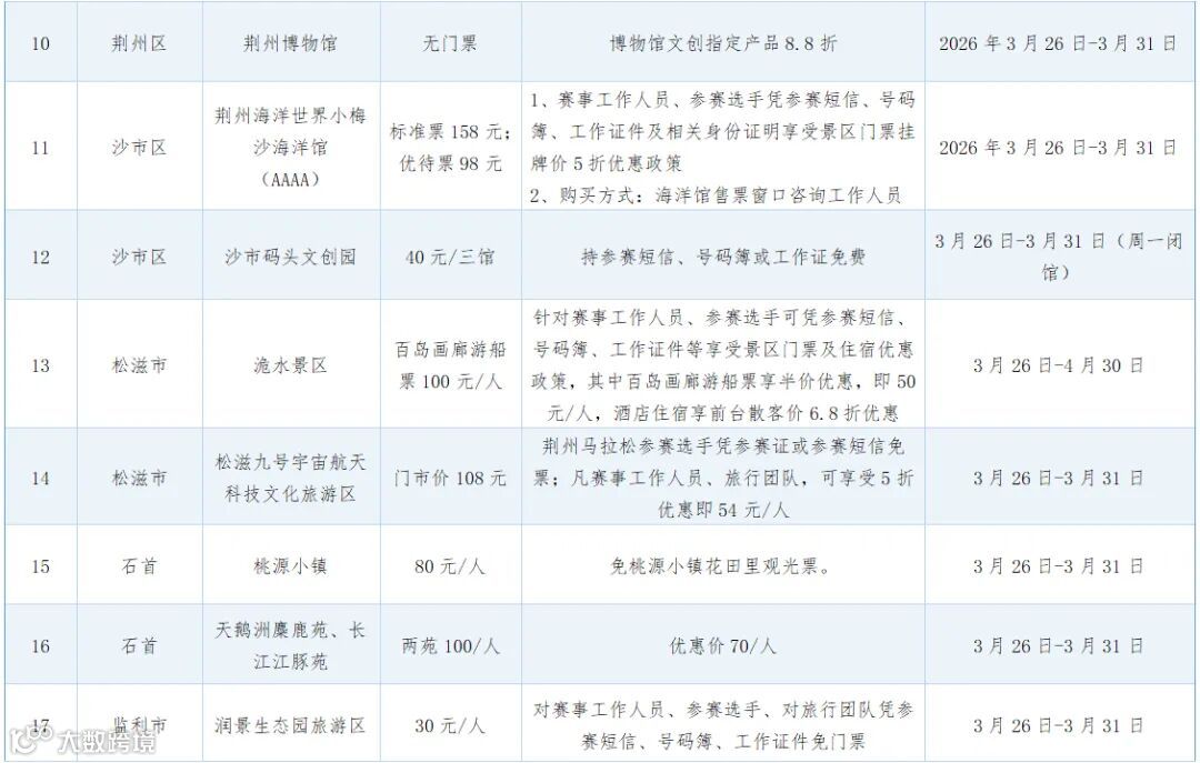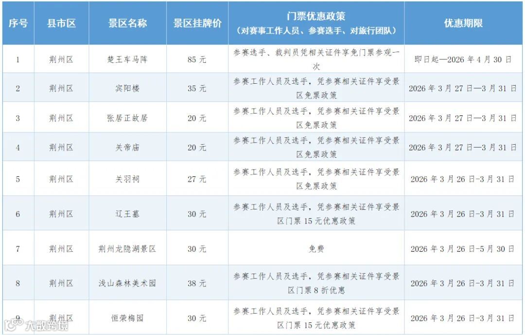参赛选手可凭相关凭证享优惠价游览荆州多个景区