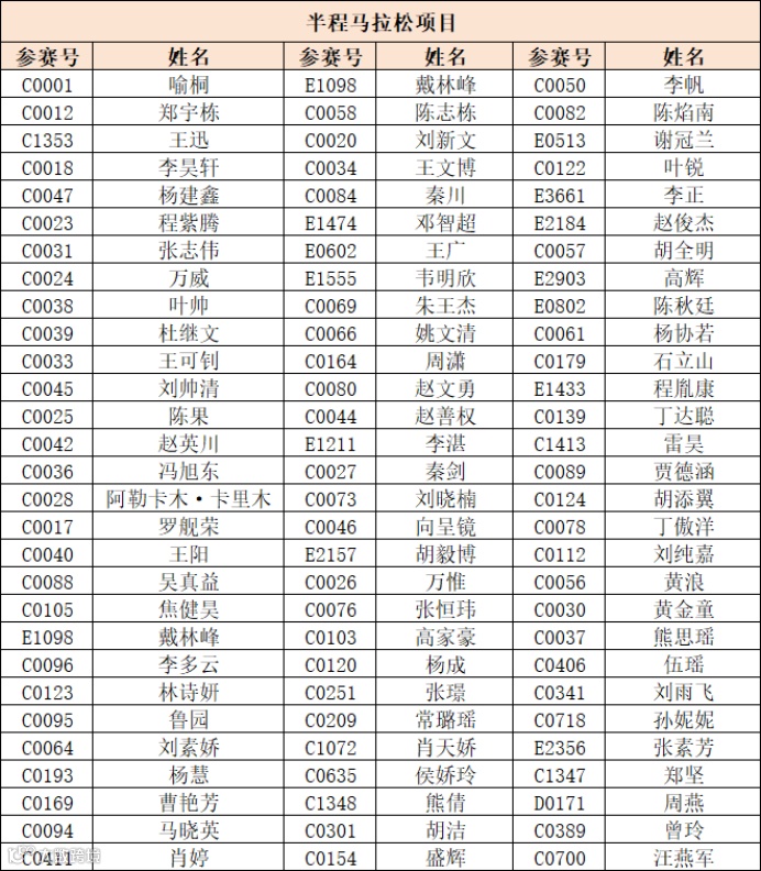 2.半程马拉松项目:男子(净计时):01:25:00(不含)以内,女子(净计时):01:40:00(不含)以内。