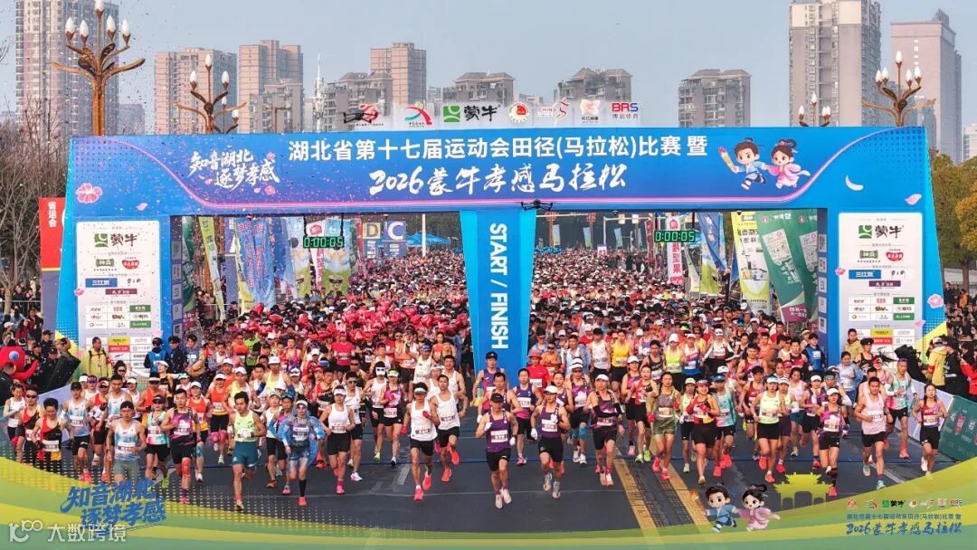 3月8日7时30分,湖北省第十七届运动会田径(马拉松)比赛暨2026蒙牛孝感马拉松在孝感市文化中心鸣枪起跑。