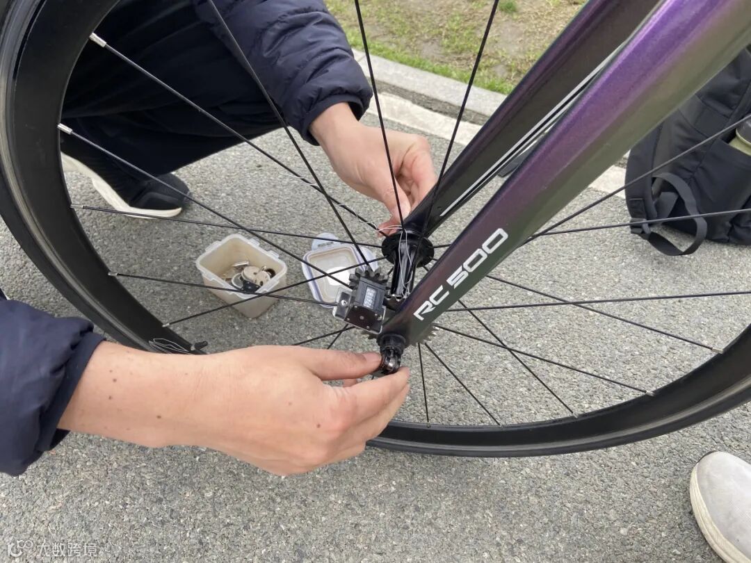 在准备工作中,丈量员江平老师先将琼斯计数器安装在自行车前轴上。用于记录自行车转动的圈数,从而计算出赛道的长度。这种经过国际田联审核的计数仪,可以通过计算自行车转动的圈数测算出自行车的行驶距离,具体测量工作大致分为前测校准、测量标记、后测校准三个步骤。