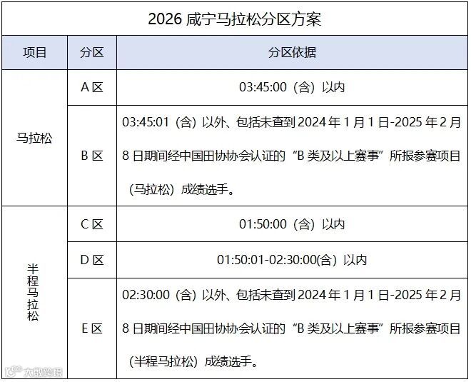 1.请仔细查阅前文的分区依据,如果您的分区与分区依据的成绩不符,请发邮件至组委会邮箱xianningmarathon@163.com(邮件标题为“申请分区调整”,邮件内容需要包含姓名、身份证号码、联系方式、符合条件的B类及以上成绩证书,半马项目提供半马证书,全马项目提供全马证书)。