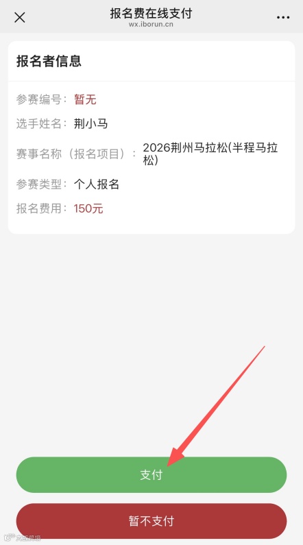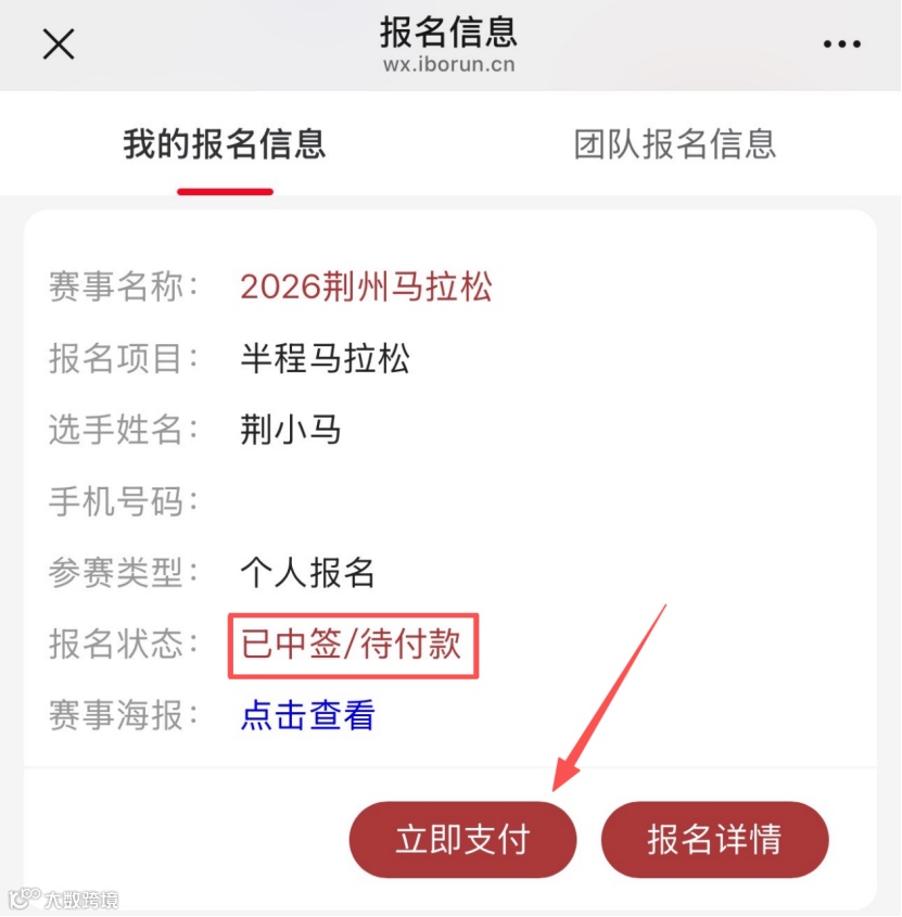 中签选手进入“报名信息”页面后,点击下方“立即支付”