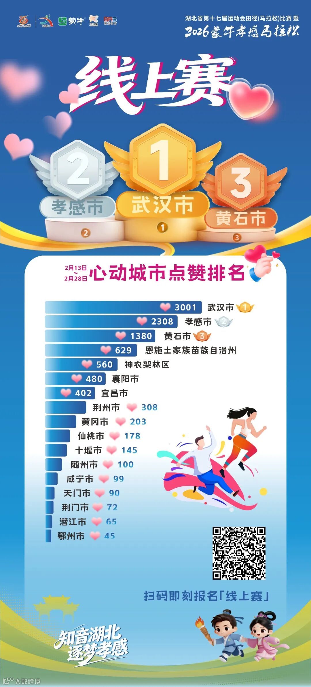 活动期间,赛事官方微信公众号“孝感马拉松”将每周更新“点赞榜单”,实时展示各地市州支持率与排名。最终,报名成功且完赛人数最多的地市州,将荣获“人气心选之城”称号,支持该城市的选手可获得对应地市州电子版荣誉勋章。
