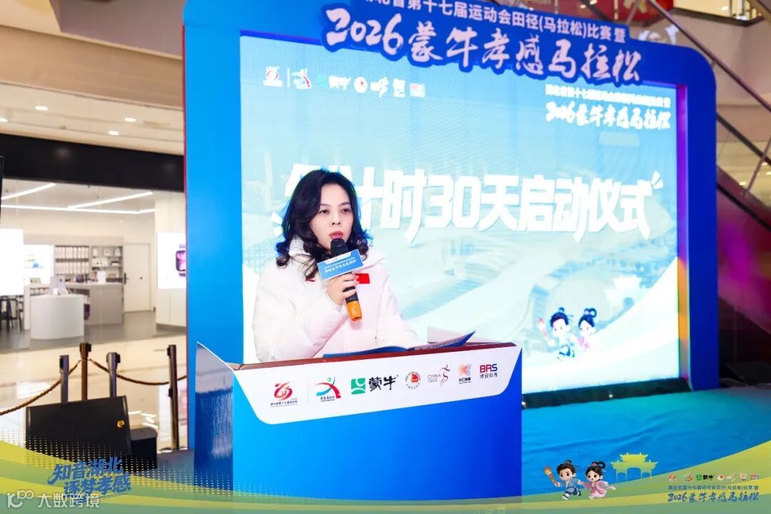 下午15:30,湖北省第十七届运动会田径(马拉松)比赛暨2026蒙牛孝感马拉松倒计时30天暨“我与省运同框”主题系列活动启动仪式准时拉开帷幕,孝感市文化和旅游局群众体育科科长李敏捷上台致辞,并正式宣布活动启动。
