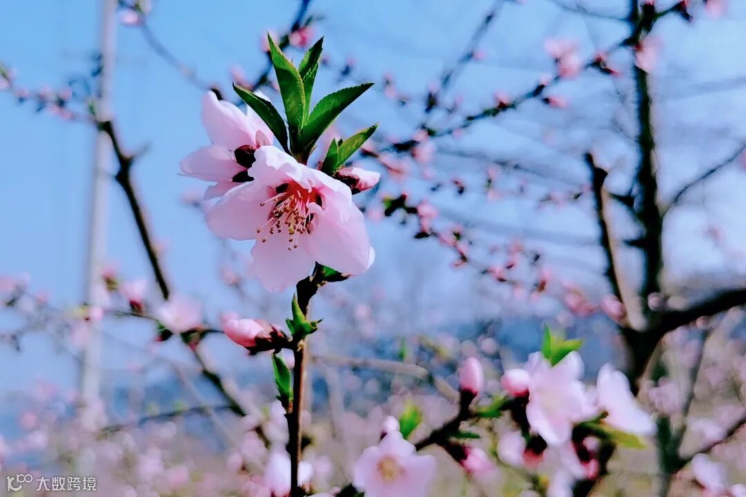 千娇百媚生的桃花如美人一样。阳春三月,桃花将无限春光演绎枝头,一片片绿叶交织点点飞红,目之所及,桃红成片。