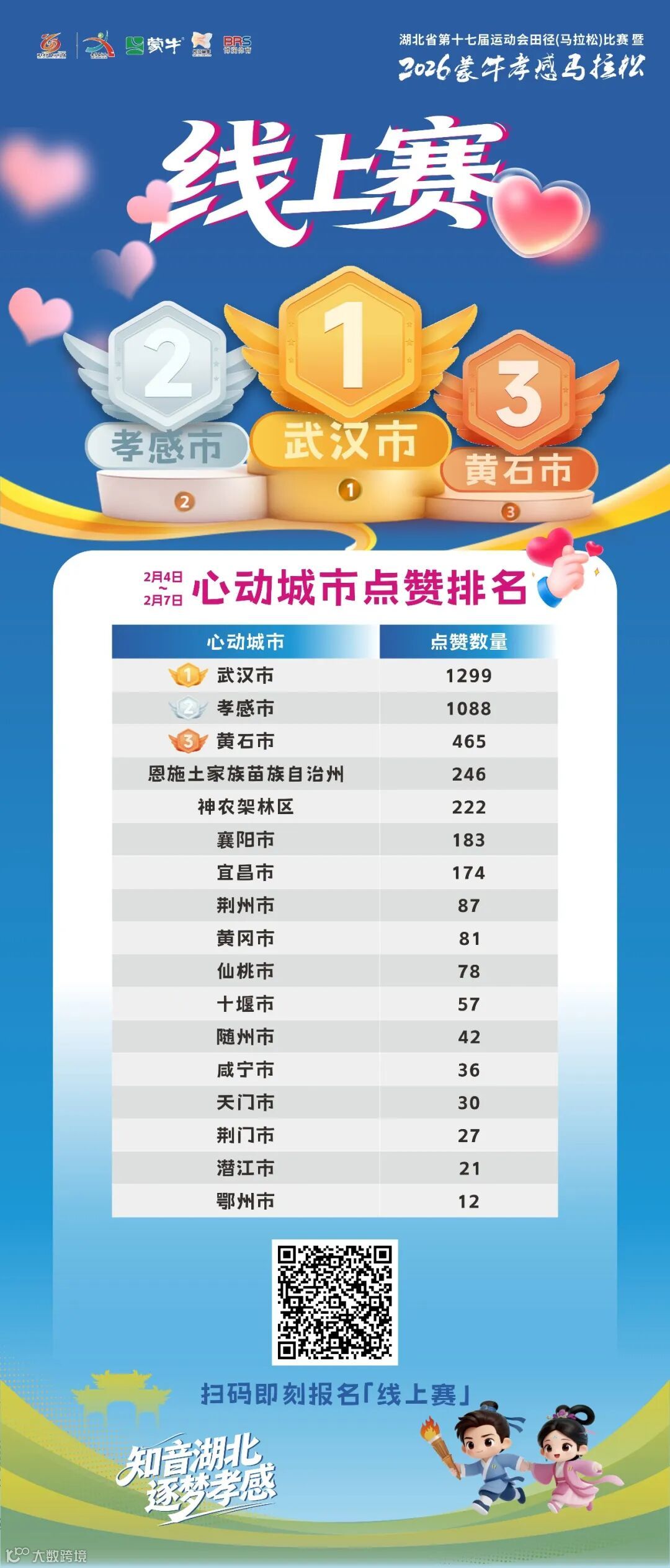 活动期间,赛事官方微信公众号“孝感马拉松”将每周更新“点赞榜单”,实时展示各地市州支持率与排名。最终,报名成功且完赛人数最多的地市州,将荣获“人气心选之城”称号,支持该城市的选手可获得对应地市州电子版荣誉勋章。