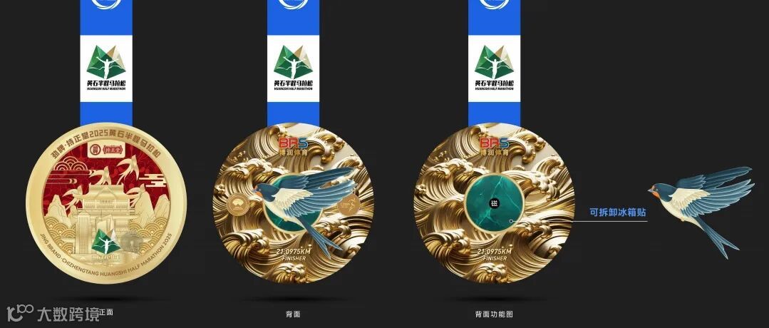 奖牌背面环绕滔滔江水,寓意黄石“临江而建、因水而生”的城市特色,正是长江与磁湖的滋养,共同孕育出黄石的深厚文脉与蓬勃繁荣。视觉中心镶嵌绿色圆环,特别采用黄石特有的孔雀石进行点缀,既让奖牌在视觉与质感上更具独特性、提升艺术价值,也将黄石丰富的矿产资源与深厚文化特色巧妙传递。圆环上方融入小燕子元素,且可拆卸作为冰箱贴,既含“燕归黄石”的灵动意趣,同时延伸奖牌的实用价值与情感联结。