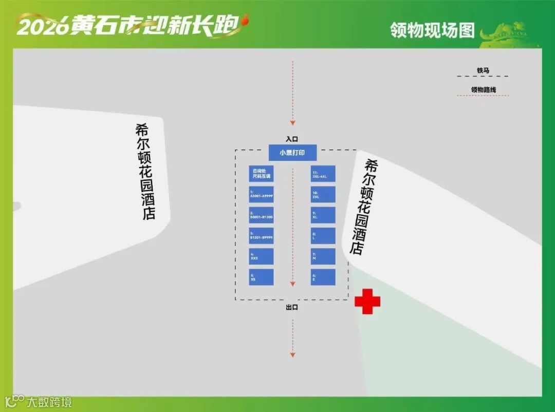 请按图中箭头方向前进,并到对应区域领取参赛物品