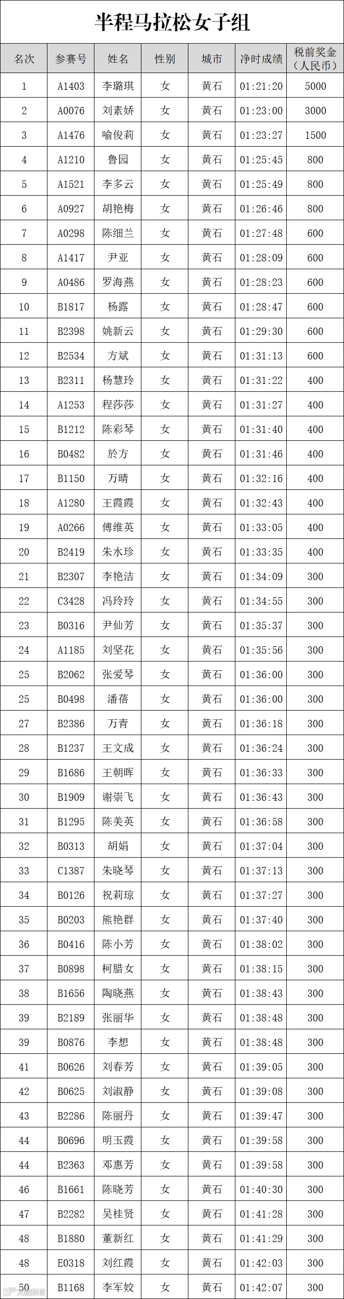 上述奖金将按照本次赛事竞赛规程规定,征收20%个人所得税,由黄石半程马拉松组委会代收代缴。