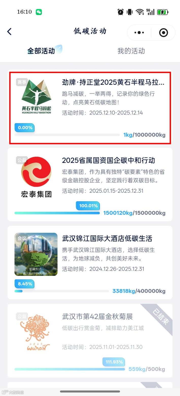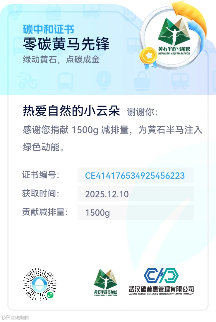 广大市民只需搜索“武碳江湖”小程序,将定位改为黄石,进入“碳绘黄石”界面,点击“一键授权”并登录,即可开通个人碳账户。“碳绘黄石”小程序低碳生活版块,已首批开通公交出行、可再生回收等低碳生活场景,市民可通过绿色出行等低碳行为获得减排量。例如:使用云闪付App每乘坐1次公交车,获得212.5克减排量;使用“爱回收”小程序每回收1公斤可再生资源,获得1500克减排量,就能为“劲牌·持正堂2025黄石半程马拉松”捐赠减排量。此次捐赠减排量活动目标是1000吨,您的每一份捐赠,都将为赛事的碳中和贡献一份力量。而且,所有为该活动捐赠减排量的个人用户,都将获得个人版碳中和证书,这不仅是对您环保行动的认可,更是一份珍贵的纪念。